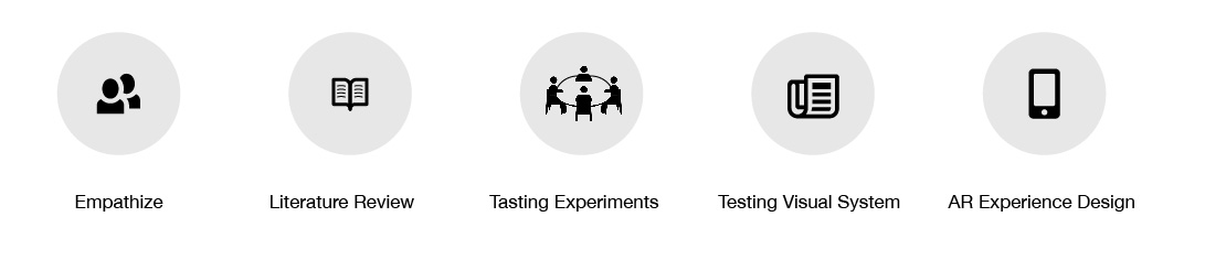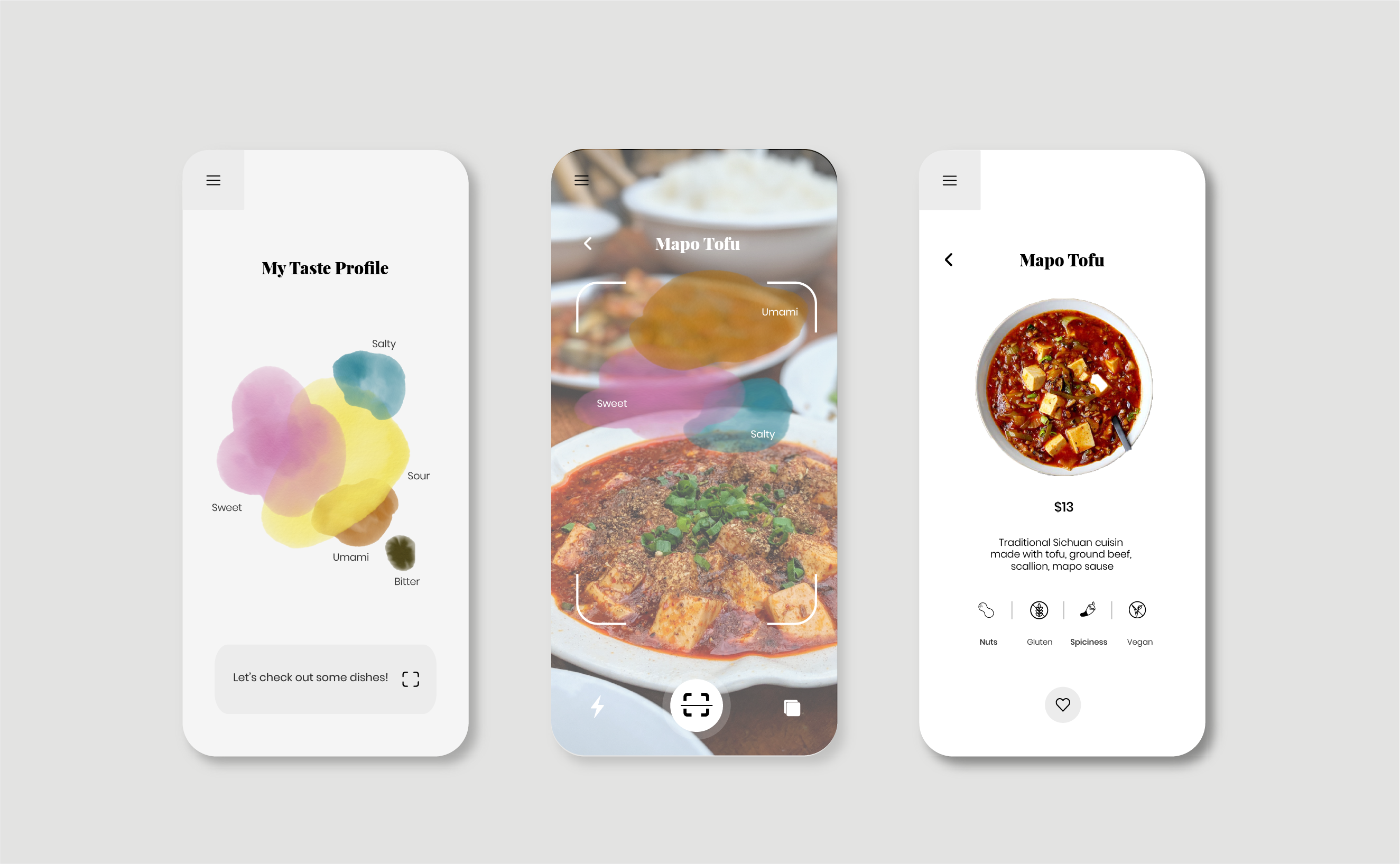 This project aims to explore ways of communicating sensory information through a human-centered perspective using augmented reality. By looking at existing examples of taste visualizations and conducting original research experiments, I created a visual system that represents the five basic tastes, which will be projected through a mobile AR app where users scan a menu or dish for insights.