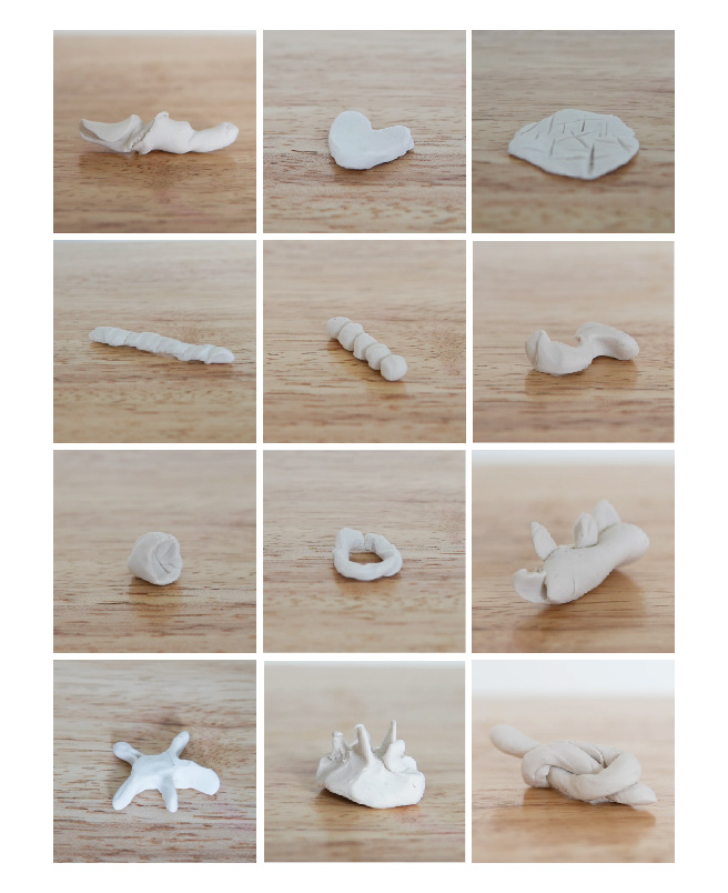I conducted a tasting experiment where participants tasted different dishes of different dominant taste. The image on the right shows part of the collection of the sculptures made by people to express what different dishes made them feel.