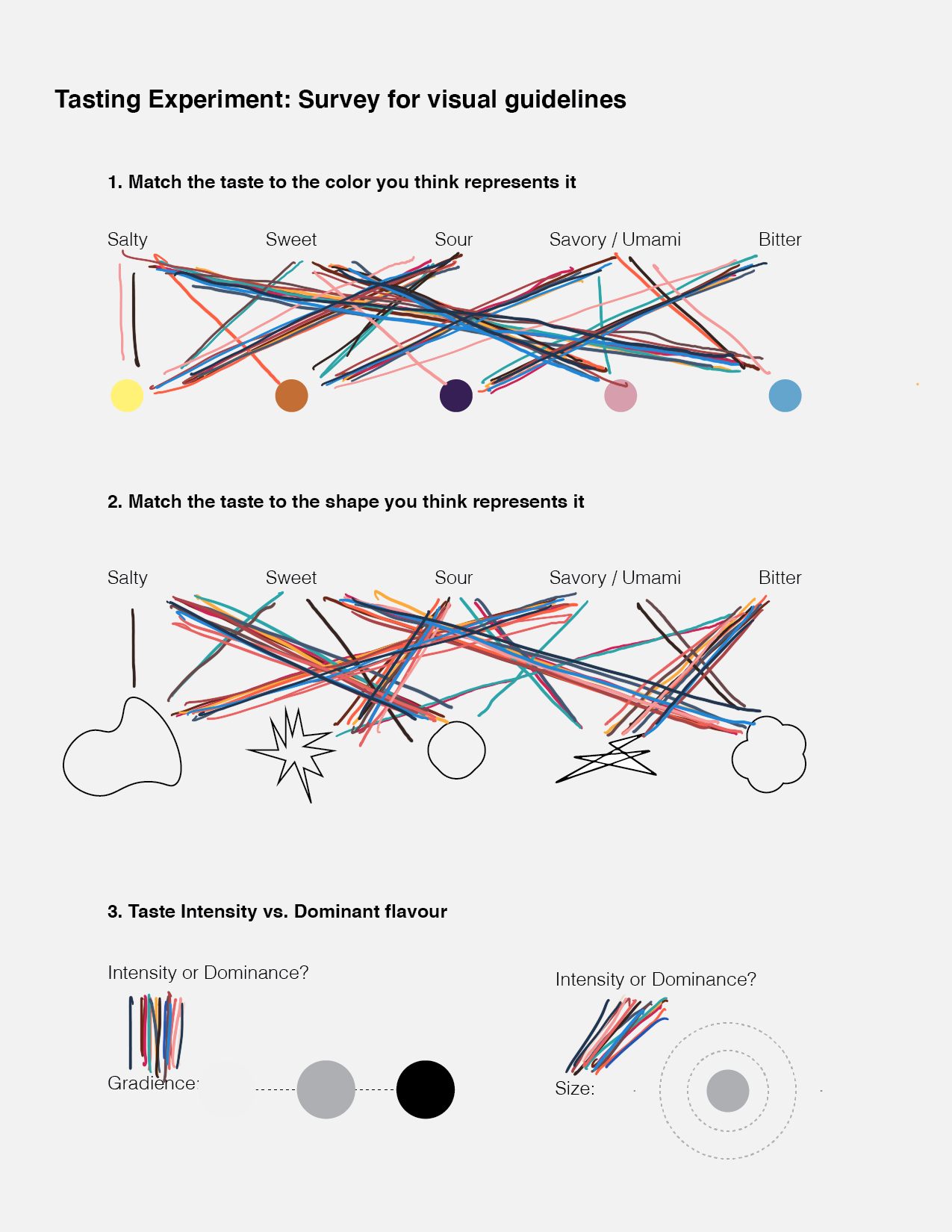 After gathering information from relevant literature and synthesizing the results from the taste sculptures, I created a survey that asked a dozen people to associate the five basic tastes with colors and shapes. I also added a question that asks people to associate intensity/domninance with gradience/size of forms.