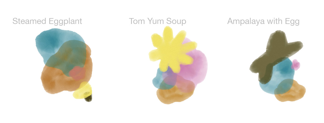 This collection serves as a visualization database in which I found commonalities to synthesize for my visual system. Key findings show that round and smooth outlines usually shows the sense of sweetness, and sometimes umami. Sharper edges are directly associated with salty, sour, and bitter tastes.