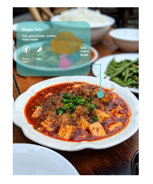 The image on the right shows a concept of AR that is used to scan mapo tofu for information on the ingredients, dietary information and taste profile. Users will have a direct knowledge of what the food tastes like.