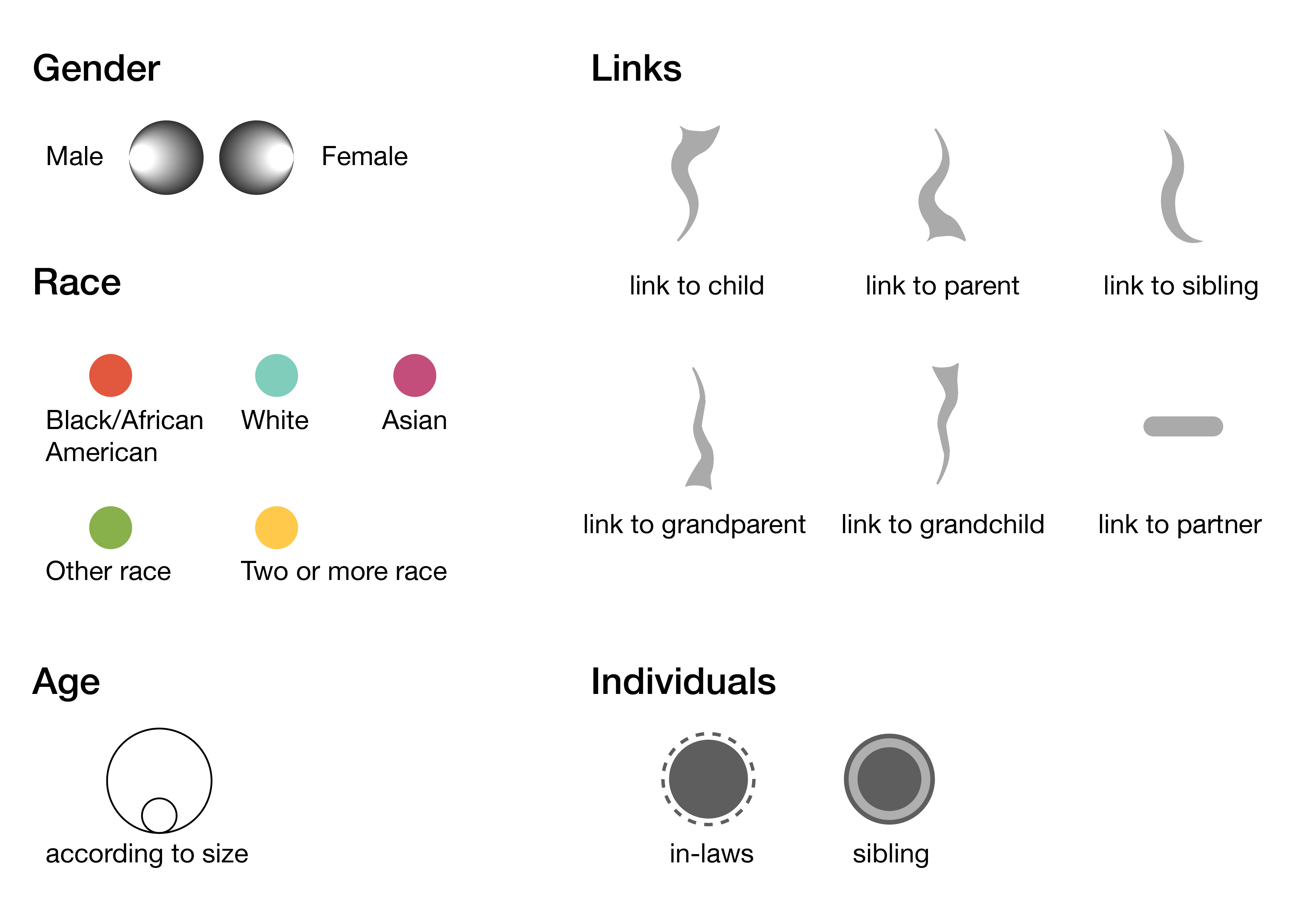 This project explores different visual languages to represent individuals and internal relationships within the family. Through abstract visual representations, contextualizing data brings these representations back to the actual families.